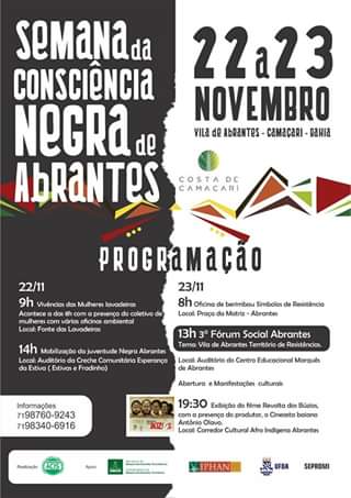A semana da consciência negra de Abrantes ocorrerá nos dias 22 e 23 de novembro com ações em diversos pontos do distrito. Dentro da programação, destaque para o terceiro fórum social Abrantes que traz como tema “Vila de Abrantes território de resistências”. A iniciativa será realizada no dia 23, as 13hs, no auditório do Centro Educacional Marquês de Abrantes, a ideia é colocar em pauta as demandas da população do Distrito e tratar aspectos turísticos, econômico e culturais da região. Vila de Abrantes é ponto forte da resistência negra em Camaçari.