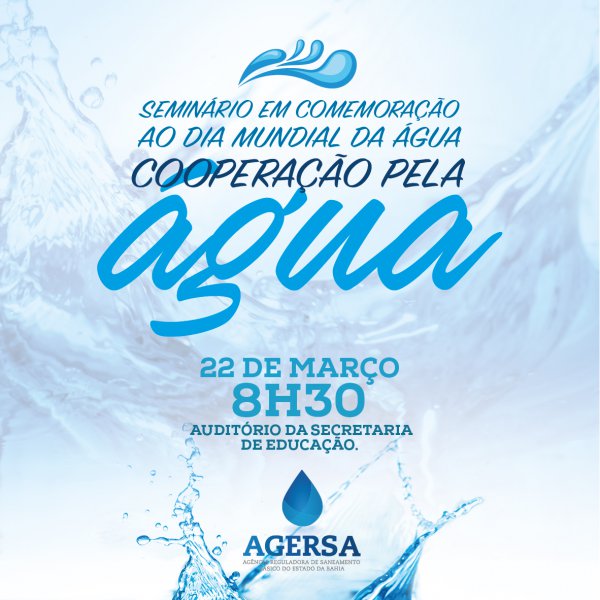 Dia 22 de março é comemorado o Dia Mundial da Água, e em homenagem a esta data, a Agência Reguladora de Saneamento Básico do Estado da Bahia (AGERSA), realizará um seminário sobre o tema. O evento ocorrerá na próxima sexta-feira (22), a partir das 8h30, no auditório da Secretária da Educação, no Centro Administrativo da Bahia.