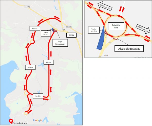 O motorista que estiver trafegando pela BA-521 poderá acessar normalmente a rotatória que dá acesso à BR-324. O condutor que estiver após as alças de acesso da BA-521, deve pegar o desvio pela BA-524 e retornar para o destino desejado.