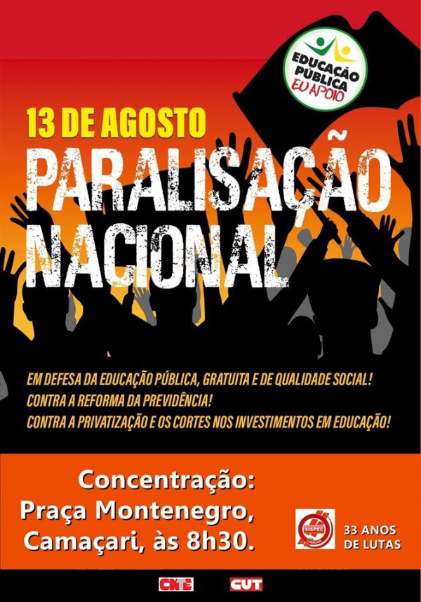 Com a frase “Em defesa da educação pública, gratuita e de qualidade social”, a categoria em Camaçari vai se reunir na Praça Montenegro, no Centro da cidade, dia 13/8, a partir das 8h30. Estudantes, educadores e a sociedade em geral está convidada a participar.
