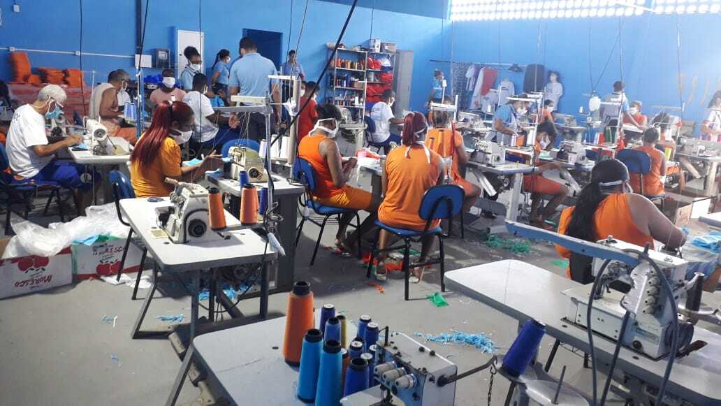 O Conjunto Penal de Itabuna (CPI) está intensificando a fabricação de máscaras de proteção. A unidade ampliou o quadro de reeducandos envolvidos na linha de produção, de 5 para 30 internos, e já produziu cerca de 5 mil unidades até agora. A produção começou há duas semanas. A meta é produzir entre 3 e 4 mil máscaras por dia até o fim deste mês, começando por 1 mil mascaras por dia a partir de segunda-feira (6).