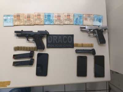 Durante a busca pessoal foram encontrados três aparelhos celulares e duas pistolas, sendo uma calibre .380 e outra .40. Eles então se identificaram como policiais militares lotados na 40ª CIPM.