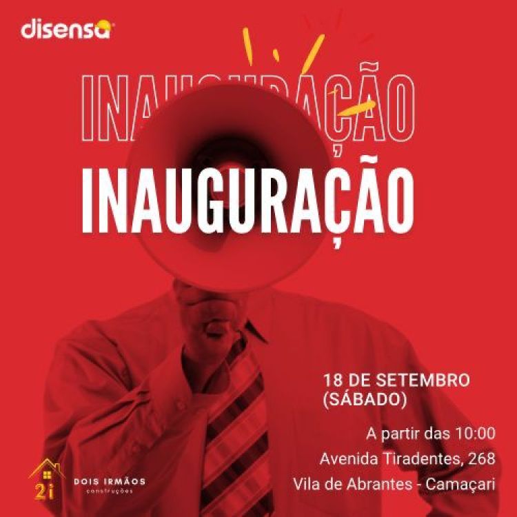 No próximo sábado (18/09), a partir das 10h, acontece a inauguração do mais novo empreendimento do ramo da construção, localizada em Vila de Abrantes, costa de Camaçari, a “Disensa: dois irmãos construções”. São 90 metros de loja lotada de produtos de qualidade, preço acessível, condições de pagamento e atendimento diferenciado.