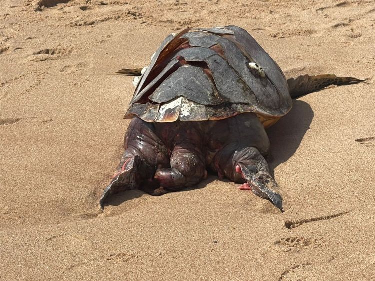 Banhistas encontraram uma tartaruga marinha morta nas areias de praia em Porto de Sauipe, em Entre Rios, no litoral norte da Bahia. Segundo informações, ela teria ficado presa em uma rede de pesca.