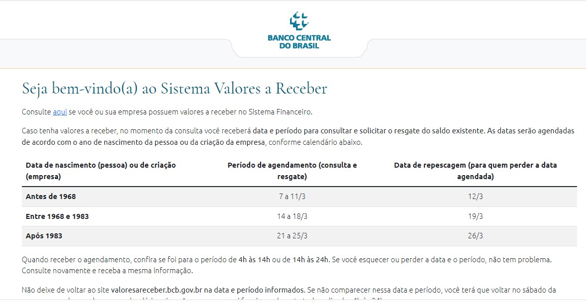 Voltou a funcionar o site do Banco Central para consulta de valores esquecidos em instituições financeiras por pessoas ou empresas. O Sistema Valores a Receber pode ser consultado no seguinte endereço na internet: https://valoresareceber.bcb.gov.br/, informando apenas o CPF, ou CNPJ e data de nascimento da pessoa ou a de abertura da empresa.
