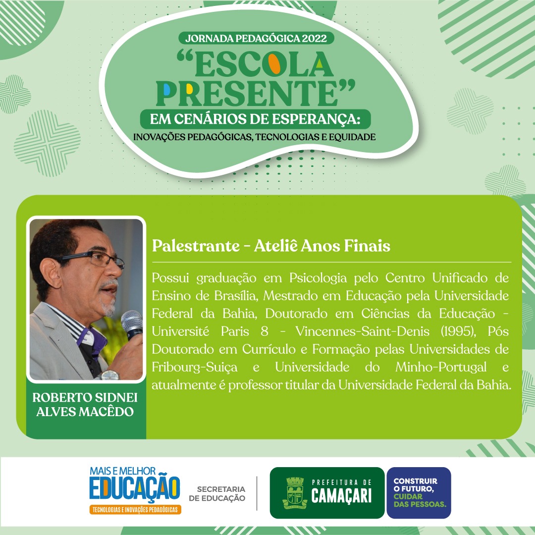 Com o tema “Escola Presente em Cenários de Esperança: Inovações Pedagógicas, Tecnologias e Equidade”, acontece, nos dias 3, 4 e 5 de março, a Jornada Pedagógica 2022. A programação inclui eventos on-line com transmissão ao vivo e presenciais, estes realizados no Vila Galé Marés, em Guarajuba, na costa do município.