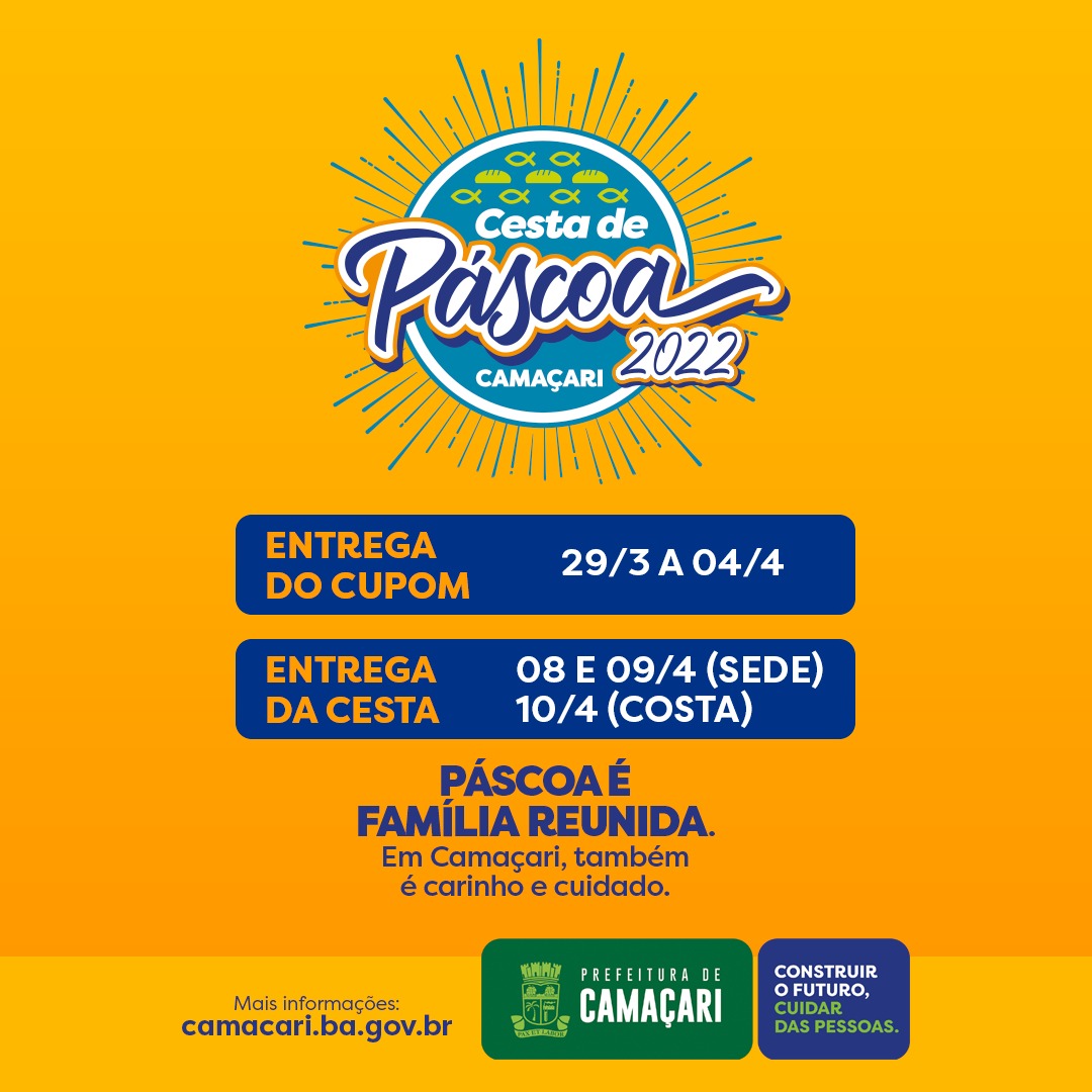 Entregue através da Secretaria do Desenvolvimento Social e Cidadania (Sedes), a gestão municipal visa garantir uma mesa mais farta e digna para as famílias durante a Semana Santa com a oferta da Cesta de Páscoa. O beneficiário poderá consultar o local de retirada dos cupons através do link https://sistemas.camacari.ba.gov.br/integra/sissocial/views/consulta_cesta/.