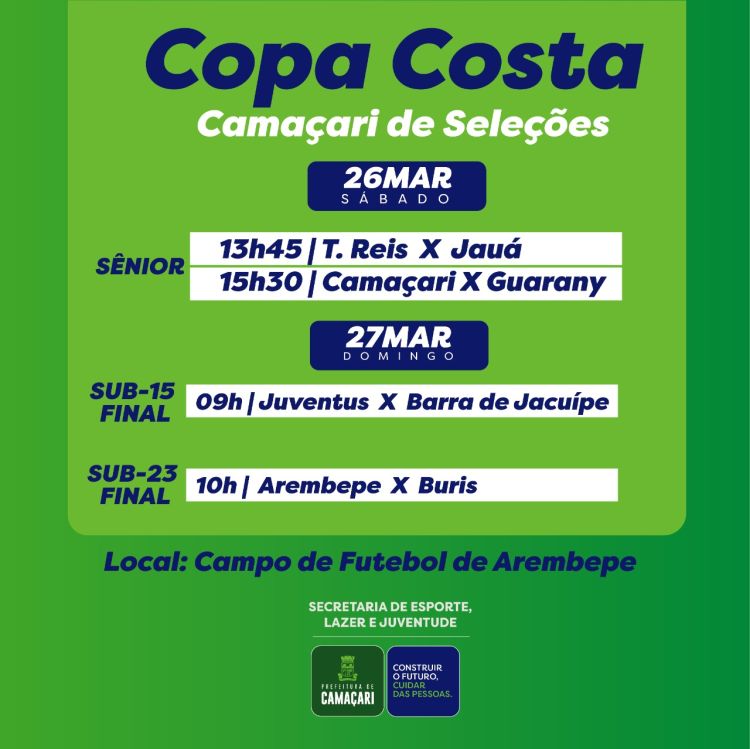 Todos os caminhos levam a Arembepe neste fim de semana, seja para desfrutar de uma das mais belas praias da Costa de Camaçari ou para acompanhar mais uma rodada da Copa Costa Camaçari de Seleções. Sábado (26/3), acontece a semifinal na categoria sênior, entre T. Reis e Jauá, a partir das 13h45, em seguida, Camaçari e Guarany. Domingo (27/3), acontecem as finais das categorias sub-15 e sub-23, entre Juventus e Barra do Jacuípe, às 9h, logo após, Arembepe e Buris, respectivamente.