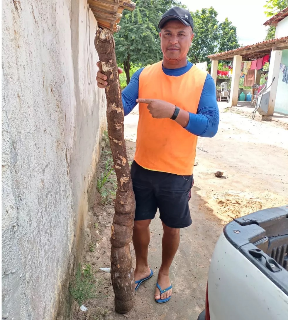 Um agricultor baiano teve uma grande surpresa durante a colheita de mandioca desse ano. Ao retirar a mandioca da terra ele percebeu que a raiz tinha cerca de dois metros e pesava quase 30 quilos.