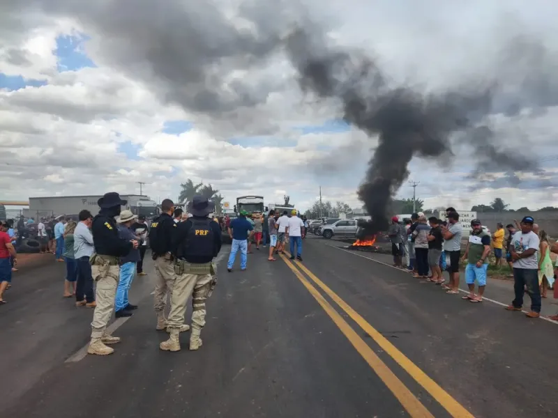 Ônibus, vans, carros de passeio e caminhões com perecíveis estão parados no local e aguardam o final da negociação entre agentes da PRF e manifestantes para a liberação das vias.