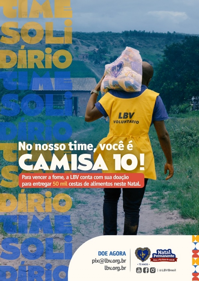 Sempre em campo nessa luta, a Legião da Boa Vontade (LBV) convoca você para reforçar seu time solidário em busca de mais uma vitória: o fim da fome no Brasil. Dessa forma, a Instituição lança a sua tradicional campanha Natal Permanente da LBV — Jesus, o Pão Nosso de cada dia! Juntos podemos acabar com a pobreza e as desigualdades sociais.