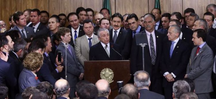 “A partir de agora, não podemos mais falar em crise, trabalharemos. […] O nosso lema, que não é o lema de hoje, o nosso lema é ordem e progresso. A expressão da nossa bandeira não poderia ser mais atual, como se hoje tivesse sido redigida”, disse, em discurso no Palácio do Planalto .“O mundo está de olho no país, e havendo condições adequadas, a resposta será rápida”, acrescentou.