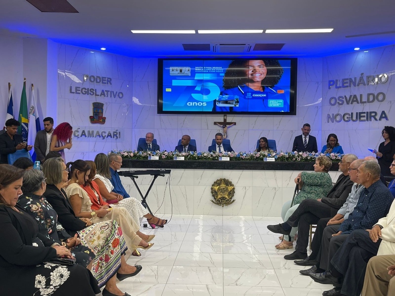 A Câmara Municipal de Camaçari celebrou seus 75 anos de fundação, com uma Sessão Especial, realizada na última terça-feira (21/03), que homenageou figuras importantes que contribuíram e ainda contribuem, para o andamento da Casa Legislativa e desenvolvimento da cidade. Marcaram presença na solenidade ex-vereadores e vereadoras, autoridades políticas e policiais, secretários municipais, representantes de entidades, além da população que lotou o plenário.