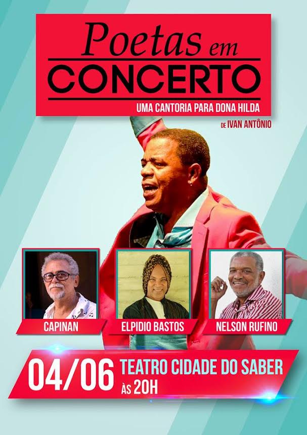 Neste sábado (04/06), acontece o show Poetas em Concerto, no Teatro Cidade do Saber (TCS), às 20h. O projeto é idealizada pelo poeta, compositor, cantor e cineasta, Ivan Antônio, a iniciativa está na segunda edição e, desta vez, recebe como convidados o poeta José Carlos Capinan, o músico Elpídio Bastos e o mestre Nelson Rufino.
