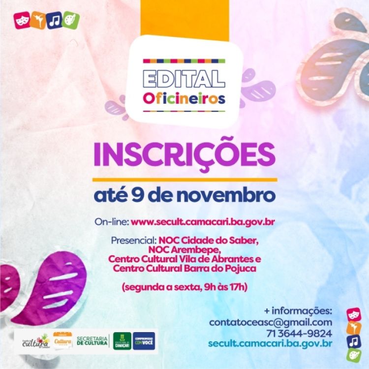 As inscrições para o Edital Oficineiros, promovido pela Prefeitura de Camaçari, através da Secretaria da Cultura (Secult), podem ser feitas até o dia 9 de novembro. O credenciamento visa a formação de um banco de profissionais com experiência técnica na área cultural a fim de ofertar serviços de capacitação em atividades culturais como instrutores, ministrando oficinas em diversas modalidades culturais, em diferentes localidades e bairros. O processo de inscrição pode ser realizado de forma presencial ou on-line.