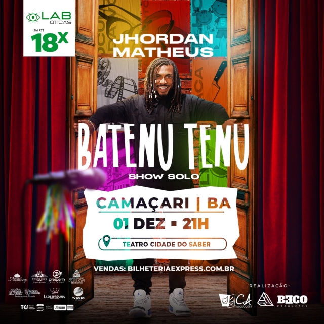 Com o show solo Batenu Tenu, o comediante Jhordan Matheus retornará à Camaçari para apresentação no dia 1º de dezembro, às 21h, no Teatro Cidade do Saber (TCS). No espetáculo, ele aborda, de forma muito bem-humorada, sobre as histórias da infância em Salvador, relacionamento familiar, dificuldades em fazer comédia, experiências sexuais e negritude. O evento conta com patrocínio da Prefeitura de Camaçari, através da Secretaria da Cultura (Secult).