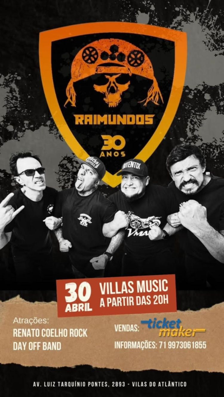 Uma das principais bandas do cenário musical do Brasil dos anos 90 está rodando o país com sua turnê comemorativa de 30 anos! O “Raimundos Turnê 30 Anos” acaba de confirmar que a Bahia está na rota dos shows. O evento será no dia 30 de abril (véspera de feriado), a partir das 20 horas, no Villas Music (antigo Armazém), em Vilas do Atlântico. A ocasião será regada a muitos sucessos que marcam a trajetória da banda, que revolucionou o rock nacional. Raimundos foi formada em 1987, em Brasília, e tem seu nome derivado de uma de suas maiores influências, a banda Ramones.