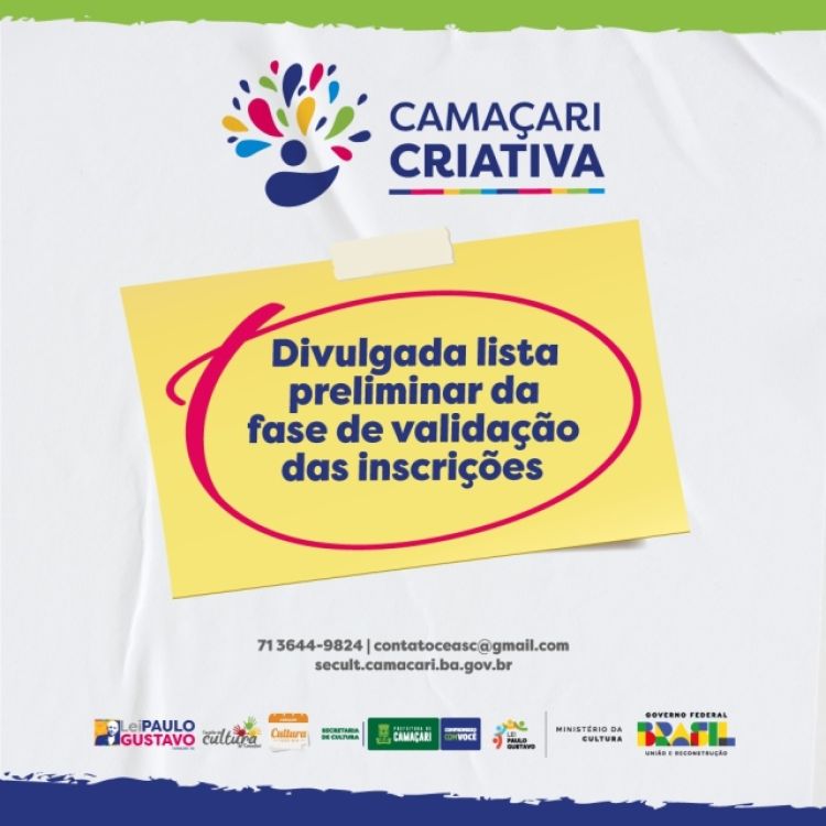 A Prefeitura de Camaçari, através da Secretaria da Cultura (Secult), divulgou a lista preliminar de proponentes habilitados na fase de validação das inscrições no edital de concurso cultural Camaçari Criativa. Os proponentes têm o prazo de cinco dias úteis, a partir da data de publicação, para solicitar a revisão dos dados.