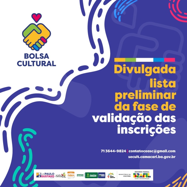 A Prefeitura de Camaçari, através da Secretaria da Cultura (Secult), divulgou a lista preliminar de proponentes da fase de validação das inscrições no edital Bolsa Cultural, que foram divididas entre as categorias bolsas Aprendizes, Monitores e Pesquisadores. A etapa consiste na verificação do correto preenchimento da ficha de inscrição no Mapa Cultural, bem como na apresentação de todos os documentos indicados. Os aprovados seguem para o segundo passo, que é a de análise de mérito cultural e bonificações.