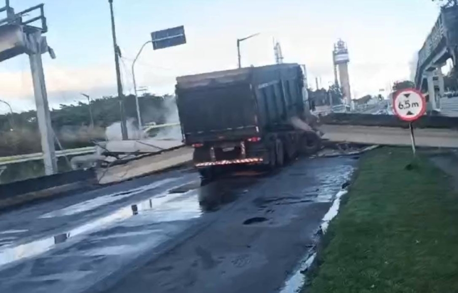 Imagens que circulam na internet mostram que ainda estava escuro quando o veículo passou pela via, atingindo a passarela com a parte mais alta da caçamba. Até a postagem dessa matéria a via estava bloqueada.
