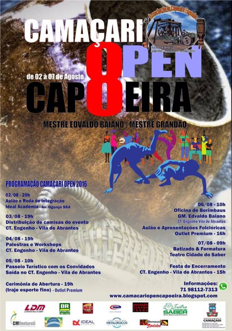 Em agosto, acontece a 8ª edição do Camaçari Open de Capoeira. O evento ocorre de 2 a 7 de agosto e a cerimônia oficial de abertura ocorre no dia 5 de agosto, no Desk de Turismo do Outlet Premium com apresentação oficial do evento para autoridades, imprensa e convidados. A programação inclui palestras e workshops, passeios turísticos com convidados, oficina de berimbau, apresentações folclóricas, batizado e formatura, dentre outras atividades.