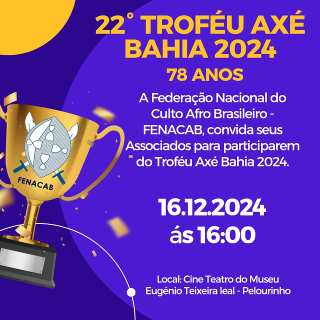 No próximo dia 16 de dezembro a Federação Nacional do Culto Afro Brasileiro (Fenacab) realiza a 22º edição do Troféu Axé Bahia. O prêmio reconhece o trabalho de cidadãos, agentes público, políticos e outras autoridades em prol da preservação e proteção do culto afro brasileiro e da luta contra a intolerância e o racismo religioso.