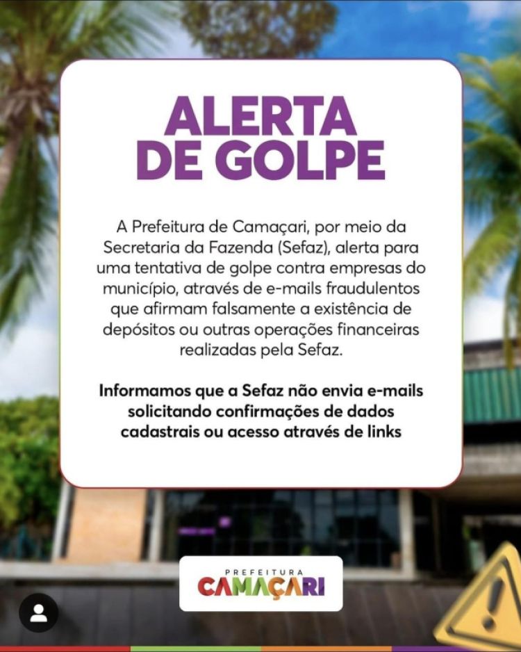 A Prefeitura de Camaçari, por meio da Secretaria da Fazenda (Sefaz), alerta para uma tentativa de golpe contra empresas do município, através de e-mails fraudulentos que afirmam falsamente a existência de depósitos ou outras operações financeiras realizadas pela Sefaz. Informamos que a Sefaz não envia e-mails solicitando confirmações de dados cadastrais ou acesso através de links.