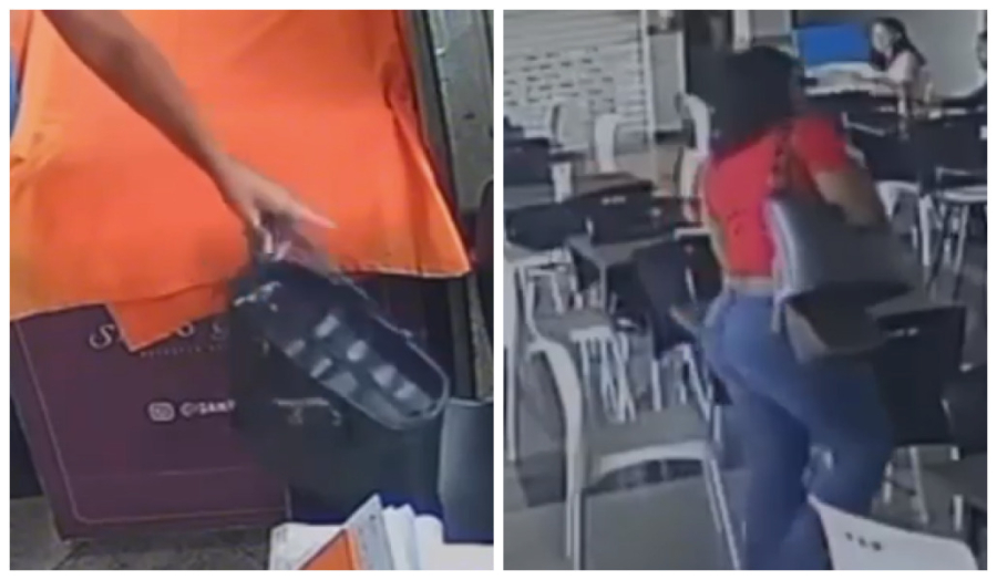 A mulher de blusa vermelha e calça jeans, tomava café encostada a um freezer, quando pega a bolsa em cima de uma cadeira, leva até uma mesa para disfarçar, desce as escadas e saí tranquilamente do ambiente. Ao perceber o sumiço do objeto, a dona busca as imagens e procura a acusada.