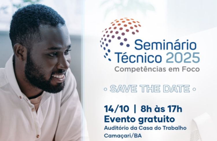 Acontece gratuitamente dia 14 de outubro, das 8h às 17h, o “Seminário Técnico 2025: Competências em Foco”, no auditório da Casa do Trabalho, no Centro de Camaçari. O evento, que visa debater o futuro profissional técnico, é realizado pelo Senac e as vagas são limitadas.