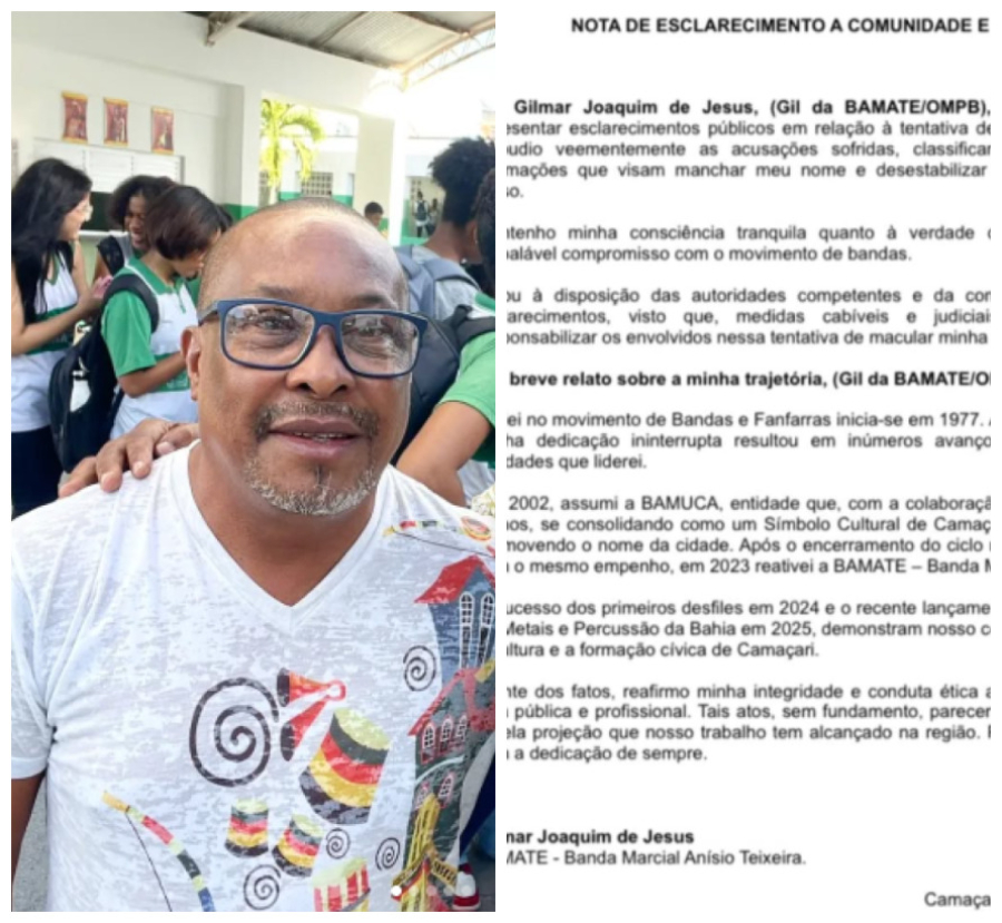 No início desta semana, alguns perfis de Camaçari no Instagram, divulgaram um áudio de uma aluna da Banda Marcial Anísio Teixeira, comentando com um colega uma fala do presidente do grupo, Gilmar Joaquim, em relação ao comprimento de sua camisa. Em função da distorção de sua fala, o gestor da BAMATE emitiu uma nota de esclarecimento, destacando que sua abordagem foi no sentido de orientação, e jamais de assédio.
