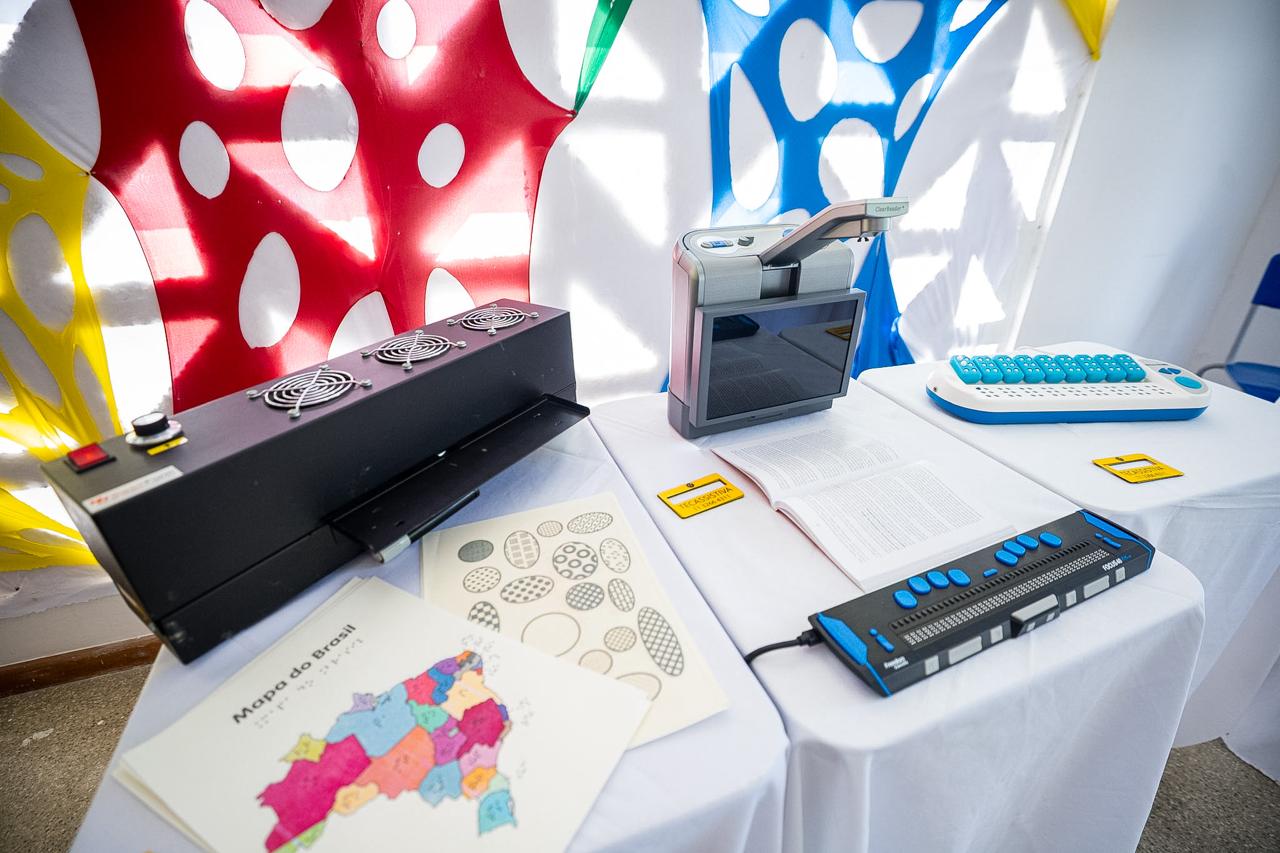 Entre os equipamentos estão digitalizador, leitor e ampliador (baixa visão, cegueira, surdocegueira, TDAH, TEA e dislexia); alfabetização Braile (cegueira, surdocegueira e espacialização em Braile); lupa eletrônica portátil (baixa visão); máquina de relevos táteis (baixa visão, cegueira, surdocegueira, TDAH, TEA e dislexia); e máquina de escrever em Braile.