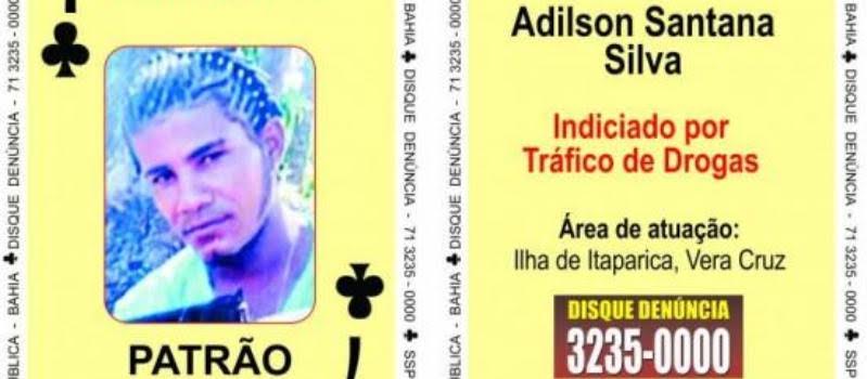 A polícia prendeu nesta quinta-feira, 09, um jovem de 20 anos, identificado como Adilson Santana da Silva, conhecido como Patrão. Ele foi preso durante operação conjunta das polícias Civil e Militar na Ilha de Itaparica. Adilson era o Sete de Paus do “Baralho do Crime”, uma ferramenta criada para compartilhar as fotos dos criminosos mais procurados do estado.
