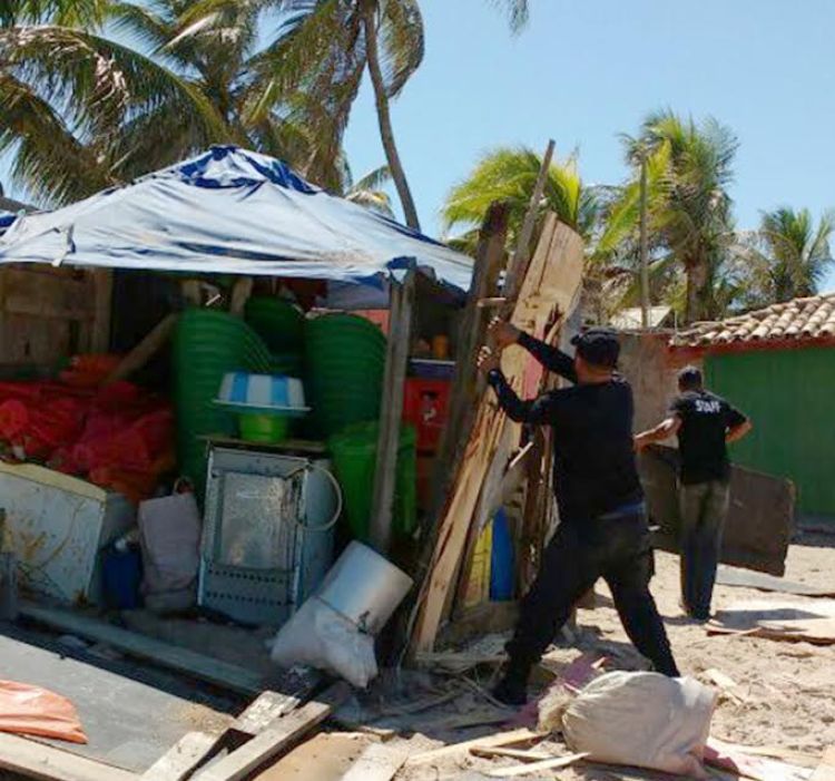 Agentes da Secretaria do Desenvolvimento Urbano e Meio Ambiente (Sedur) e a Limpec – Limpeza Pública de Camaçari, com apoio da 59ª Companhia Independente de Polícia Militar retiraram nessa quarta (10/5), nove barracas instaladas irregularmente na Praia da Sororoca, na localidade de Jauá, um dos destinos mais procurados por turistas no Litoral Norte da Bahia.